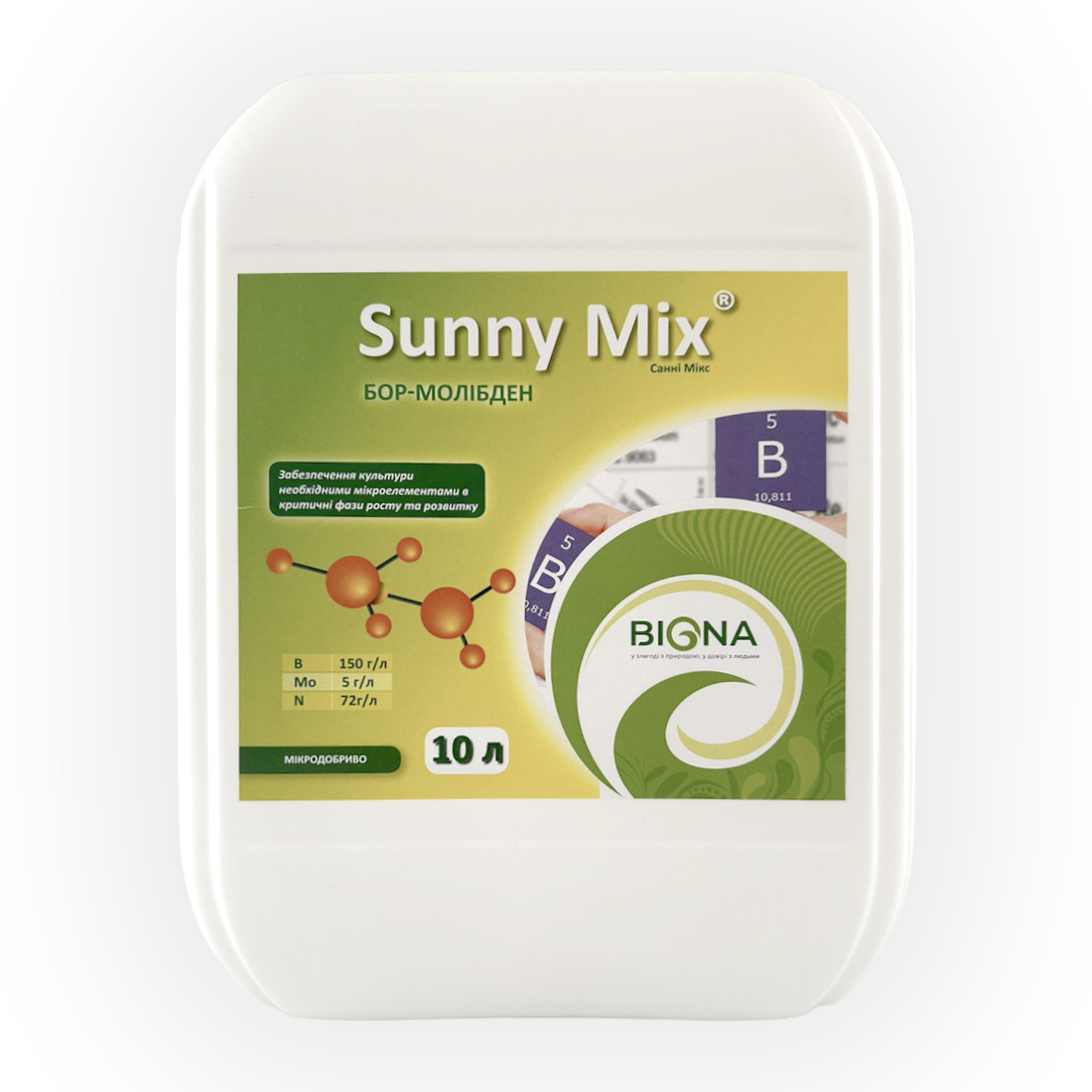 Біопрепарат комплексної дії Sunny Mix® Бор-Молібден поєднує найважливіші мікроелементи у хелатній формі. Підживлення сільськогосподарських культур за допомогою цього органічного добрива — це екологічний варіант доставлення поживних речовин рослинам. Оскільки препарат від компанії Biona є нешкідливим, він може використовуватися навіть на ділянках, де не було проведено аналіз ґрунту.